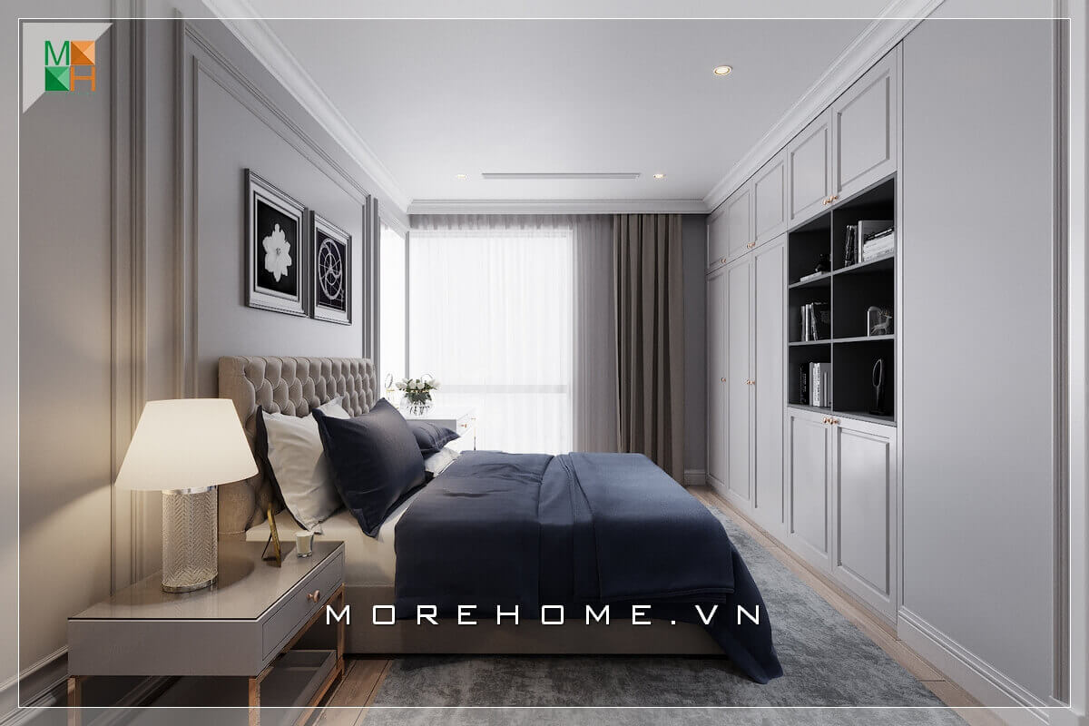 Phòng ngủ của căn hộ chung cư bố trí tủ quần áo thiết kế hiện đại đặt âm tường tinh tế gọn gàng thoáng đãng.