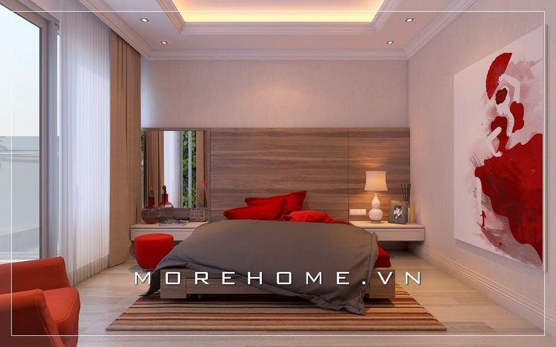Nội thất phòng ngủ gỗ công nghiệp hiện đại, điểm nhấn độc đáo với chi tiết màu đỏ tạo nên sự cá tính, khác biệt cho chủ nhân của căn phòng
