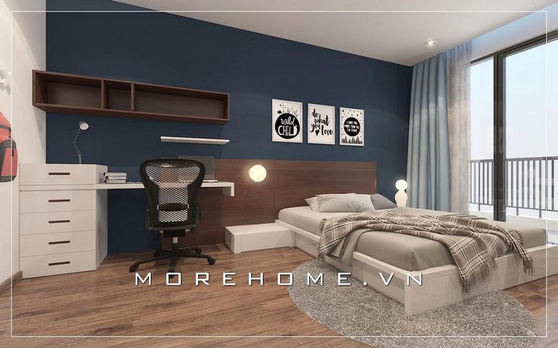 Nội thất phòng ngủ con trai hiện đại, chất liệu gỗ công nghiệp được gia chủ lựa chọn tạo cảm giác thanh thoát và nhẹ nhàng hơn