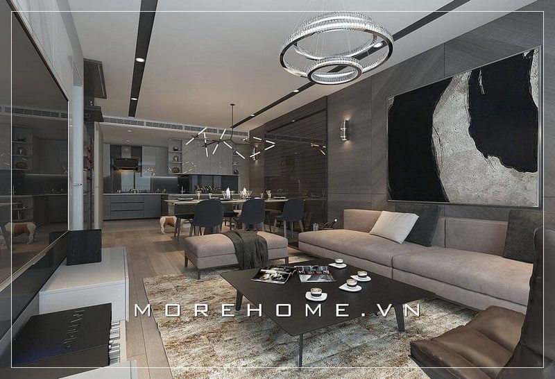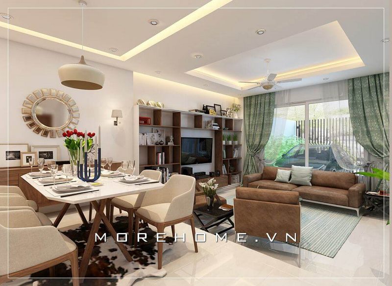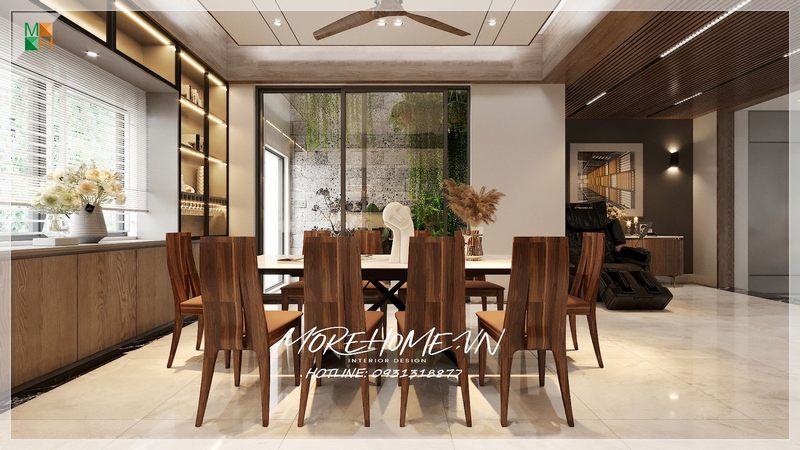 Thiết kế phòng ăn hiện đại với mẫu bàn ăn gỗ kết hợp mặt bàn đá sang trọng, ấm cúng