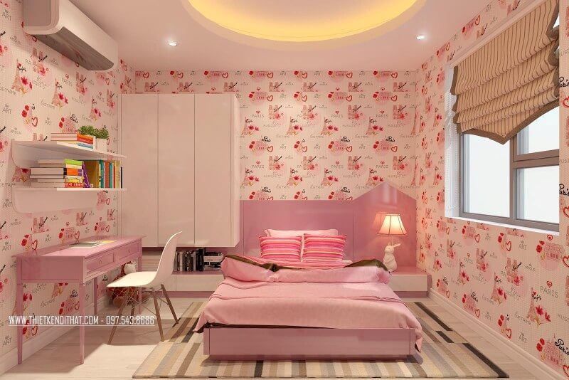 Nội thất phòng ngủ con gái với 2 gam màu trắng - hồng chủ đạo tạo nên cảm giác tươi mới và sáng sủa hơn cả