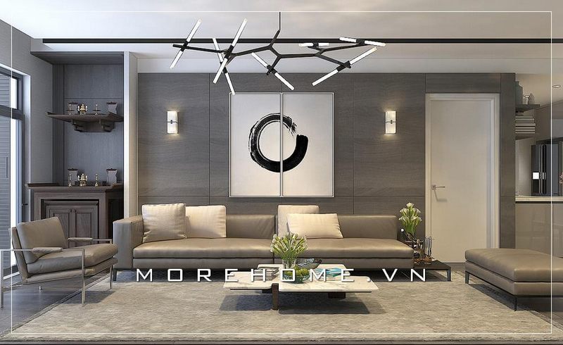 Bộ sofa bọc vải cao cấp với chiếc ghế sofa dài màu xám và hai ghế đơn màu xám tạo điểm nhấn nổi bật cho phòng khách chung cư