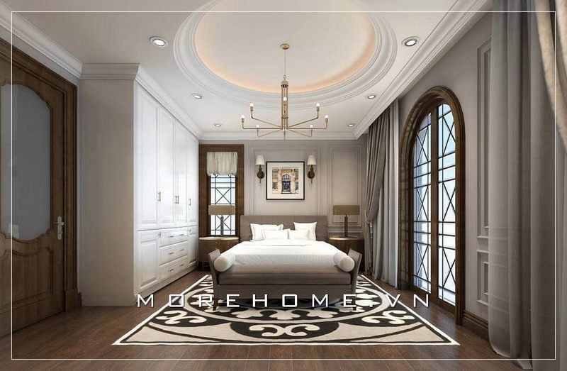 Thiết kế giường ngủ biệt thự tân cổ điển ấn tượng với từng đường nét hoa văn to uốn lượn mềm mại tạo nên ấn tượng không thể nào quên của mẫu giường ngủ đẹp này