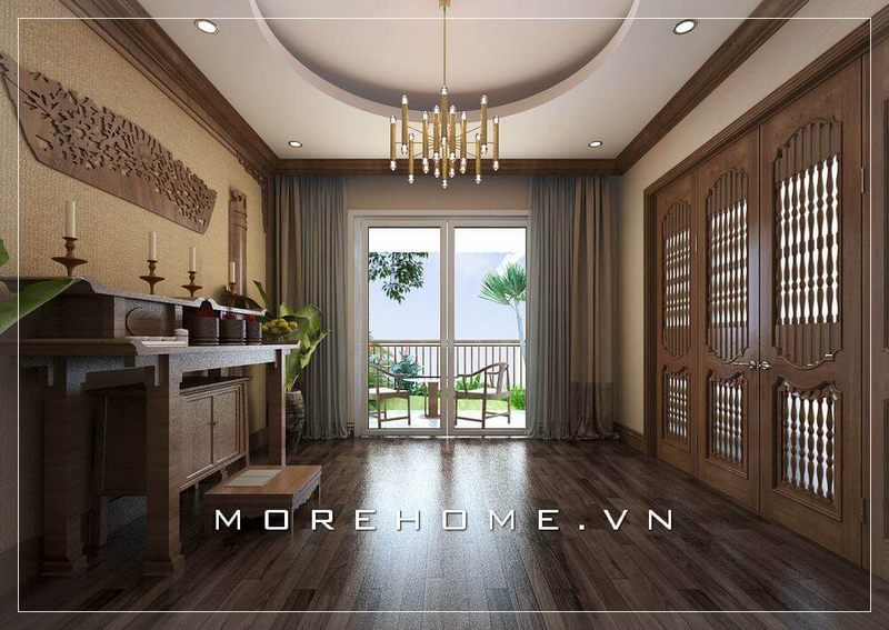 Thi công bàn thờ gia tiên gỗ tự nhiên phong cách indochine không gian thiêng liêng nhất trong mỗi ngôi nhà, thể hiện sự thành kính, cuội nguồn đối với tổ tiên cũng như cầu bình an, may mắn đến với những người thân yêu