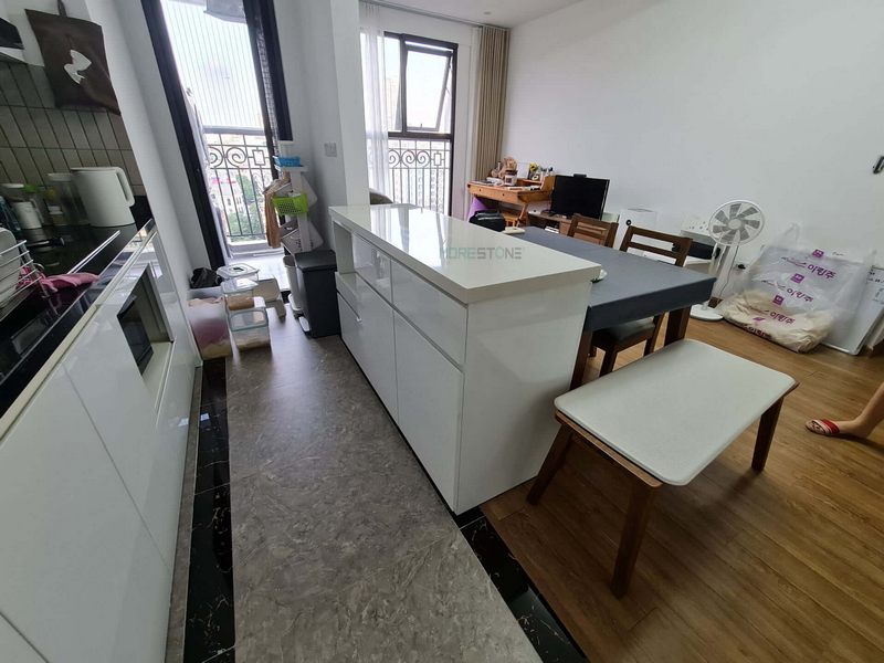 Thi công đảo bếp mặt đá Himacs màu trắng rất sang trọng thể hiện gia chủ là một người đầu tư và yêu không gian bếp ngôi nhà mình.