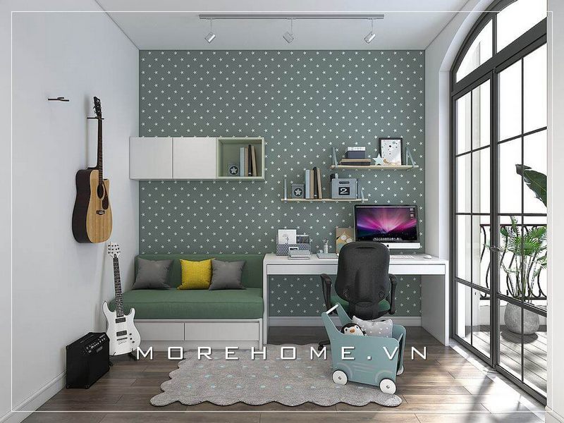 Không gian phòng học của bé trai được thiết kế ở một góc riêng trong phòng ngủ, được thiết kế tiện nghi với mẫu bàn học gỗ công nghiệp đơn giản kết hợp ghế sofa thư giãn tạo sự năng động, riêng tư giúp con thoải mái nhất trong không gian học tập