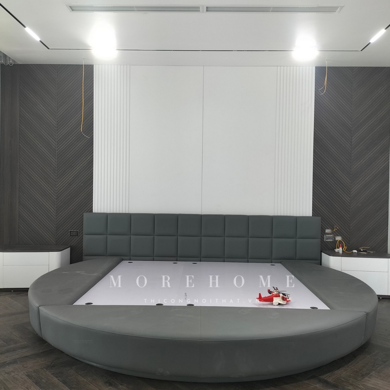Thi công giường ngủ tròn bọc da màu xám mẫu giường độc đáo được nhiều người chào đón mang đến sự mới lạ, đặc biệt cho không gian.
