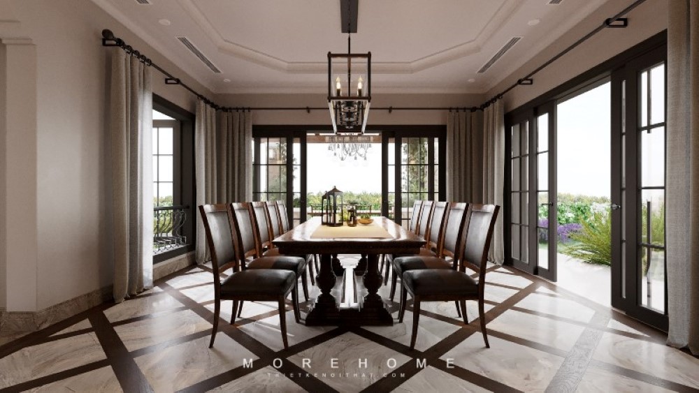 Thiết kế nội thất phòng ăn biệt thự gỗ tự nhiên phong cách tân cổ điển sang trọng và đẳng cấp