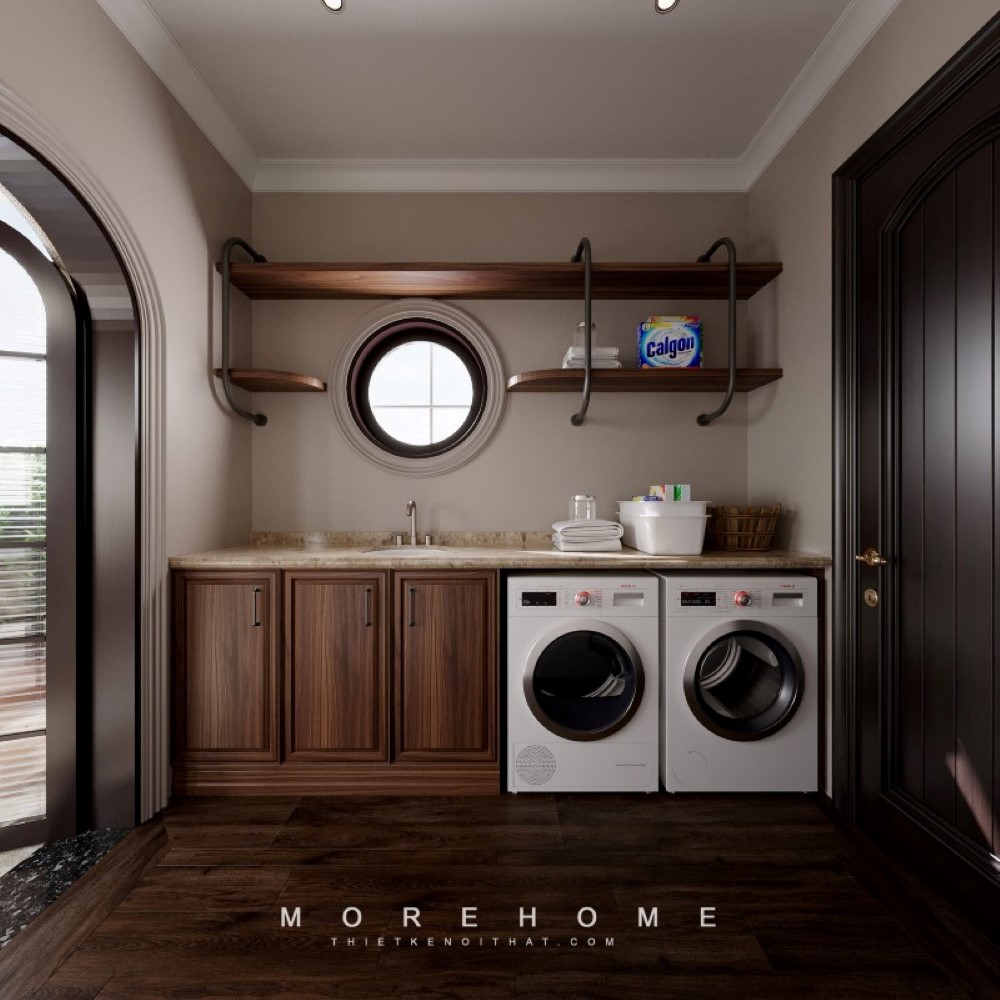 Tận dụng tối đá diện tích và công năng với mẫu tủ logia kết hợp mặt đá chậu rửa cạnh ban công phơi đồ.