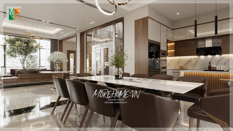 Thiết kế tủ bếp liền kề với không gian ăn uống giúp gia chủ có bữa cơm ngon miệng và thuận tiện hơn cả