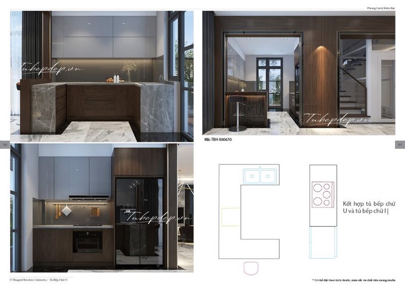 Mẫu thiết kế phòng bếp với hệ tủ bếp chữ bằng gỗ công nghiệp cho chung cư, nhà phố, biệt thự hiện đại