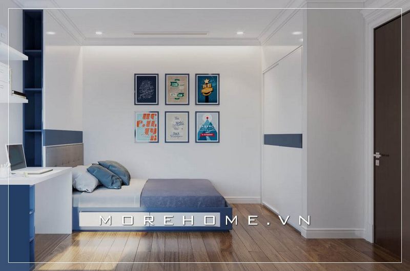 Để thiết kế phòng ngủ cho bé trai tại chung cư hiện đại, các đường nét nội thất được lựa chọn đơn giản và tinh tế, bao gồm một chiếc giường ngủ đơn gỗ công nghiệp màu trắng, một chiếc bàn học và một giá sách được làm từ chất liệu giúp con có thể thoải mái nhất.