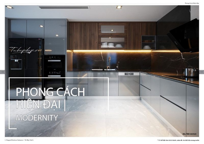Hệ thống tủ bếp hiện đại hình chữ L được thiết kế từ gỗ công nghiệp theo phong cách thời thượng, phù hợp với những gia chủ yêu thích sự trẻ trung và năng động.